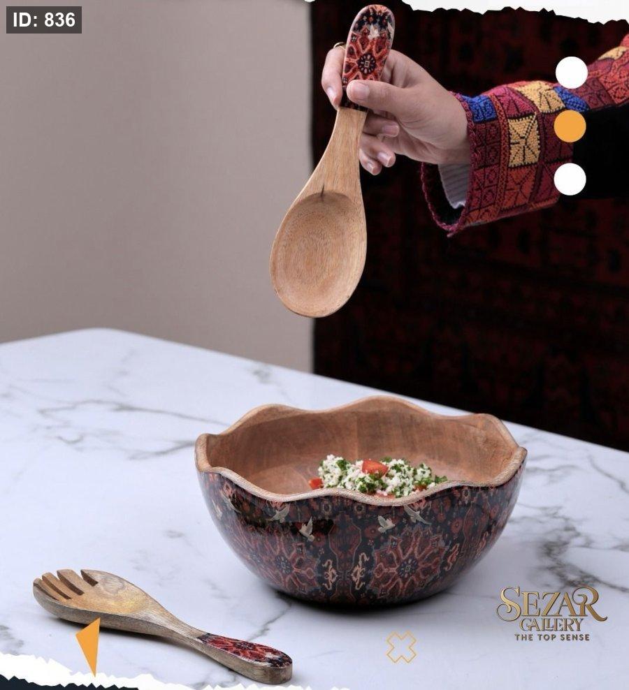 طقم جاط سلطة مع معالق من خشب المانجا بالنقشه الأفغانيه